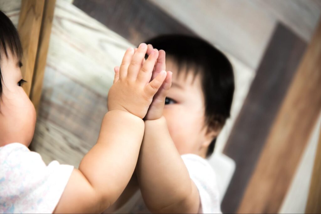 乳幼児は、相手の動作を自分の体で見たまま「鏡写し」にまねすることがよくあります。これは、相手からどう見えるかを入れ替えて考えるのがまだ難しいためです。向かい合っておとなが手を振ると、左右が入れ替わり、手の向きも反転しやすいのです(例:相手の右手に対して、自分は左手で、手のひらの向きもそのまま同じ形を作る)。